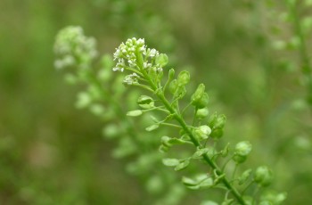 写真:マメグンバイナズナ(アブラナ科) 芦屋川 2005/6/12撮影 マメグンバイナズナの果実はほぼ円形で、先にくぼみ(相撲の軍配の形)があり、長さ3mmほど。