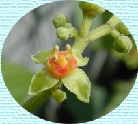 写真:ヤブガラシ(ブドウ科) 芦屋川 2005/6/12撮影 ヤブガラシの花びらは緑色。橙色の花盤(かばん)におしべが4本、めしべが1本。 開花すると花びらとおしべは散り落ちます。 橙色の花盤(かばん)はのちに淡紅色に変わります。