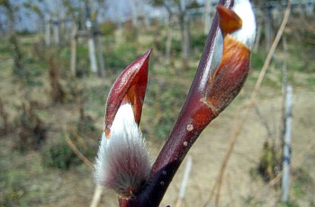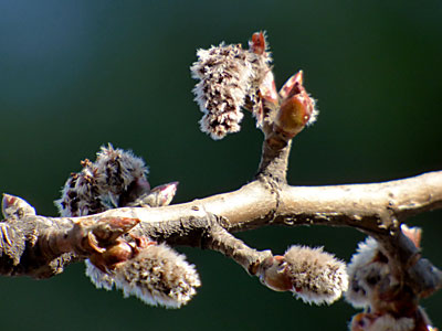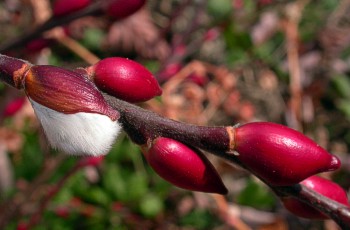 帽子のような芽鱗すっぽり脱げ落ちると絹毛に被われた花序が現れる。 花芽が赤くて大きいことからアカメヤナギともよばれている。 |