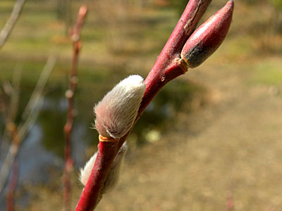 2/13 ビオトープの池ではフリソデヤナギの花芽が大きくなってきました。