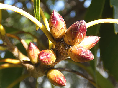 | アラカシの冬芽。赤色の光沢のある芽鱗 。 | |