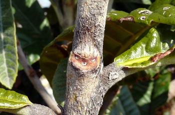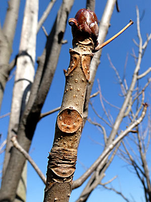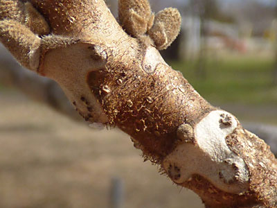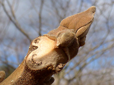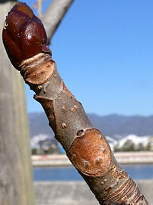 頂芽は裸芽で大きい(長さ1〜2cm)長卵形。側芽は長さ(3mm〜13mm)と小さい。 葉痕は三角形〜ハート形。維管束痕は3個。 |