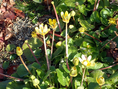 たくさん咲きだしていたヒメリュウキンカの花 黄色い6〜8枚の花弁にみえるのは萼片です。 以前 高浜町で見たヒメリュウキンカはこちら。 |