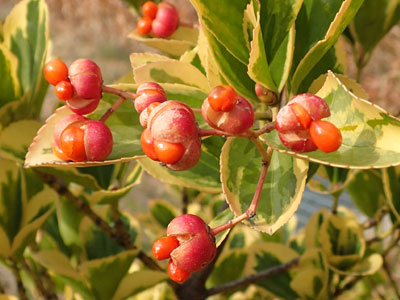 果実は刮ハで直径6〜8mmの球形、晩秋〜初冬にかけて紅色に熟し、4裂する。 種子は橙赤色の仮種皮に包まれて、落ちずにぶら下る。 |