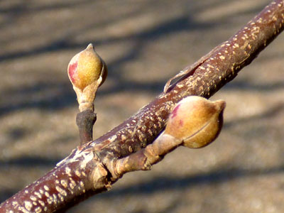 冬芽の頂芽は狭卵形で紅色。 葉腋の小さな丸い芽は花芽。 |