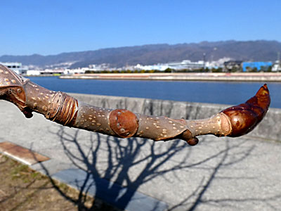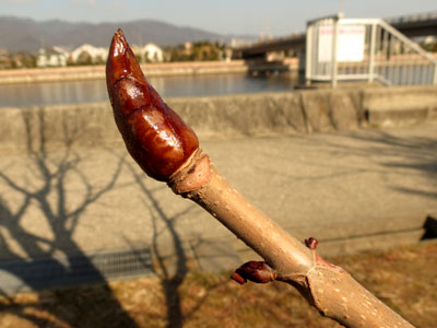 2/21 総合公園(湾岸線高架下)ではトチノキの冬芽が大きくなってきていました。葉痕、芽鱗痕がよく目立っていました。