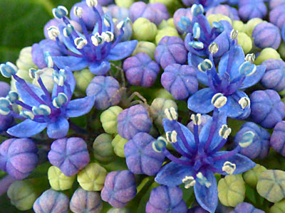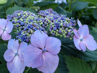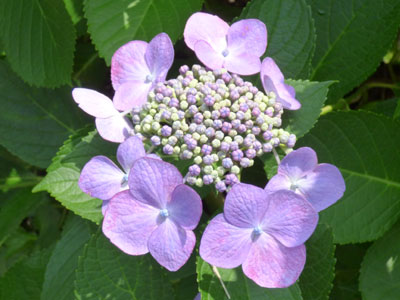 | 装飾花が美しいガクアジサイ、中心の小さい花は両性花。 | |