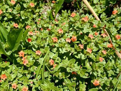 6/29 海洋町の緑道の植え込みに朱色のアカバナルリハコベが一面に咲いていて実に見事!