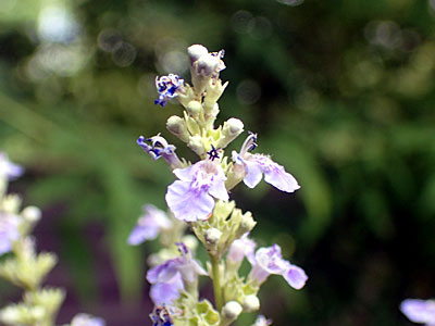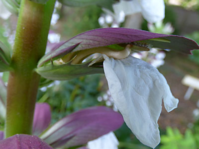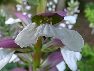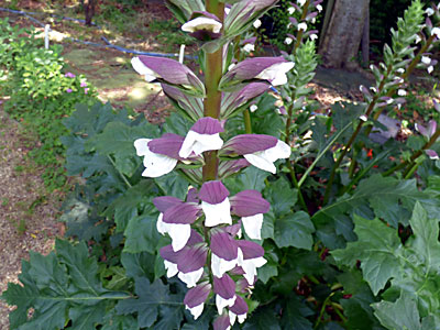 花穂は 長さが60cmぐらいあり、それぞれの花は 上部は赤紫色したひさしのような萼があり 下部は緑色で 刺の生えたあごのような苞があり それらの間から白〜淡いピンクの花が見えます。 アカンサスの葉も非常に大きく ノコギリ葉の先端に刺がある。 |