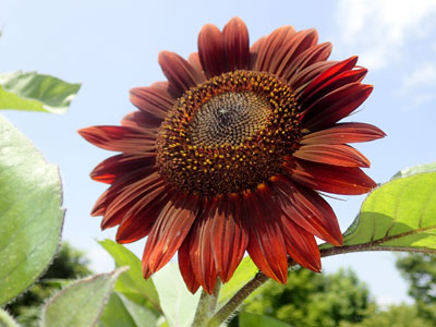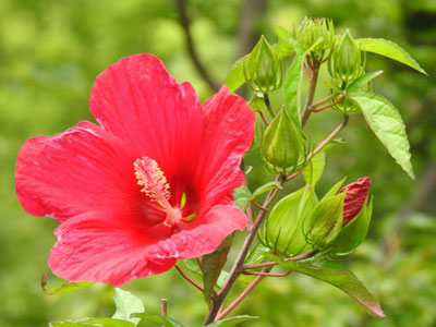 枝先に直径6cmほどの朱赤色の花を付ける。花弁は6個、薄くてしわがある。 萼は筒状で上部は6裂、肉質で光沢がある。 |