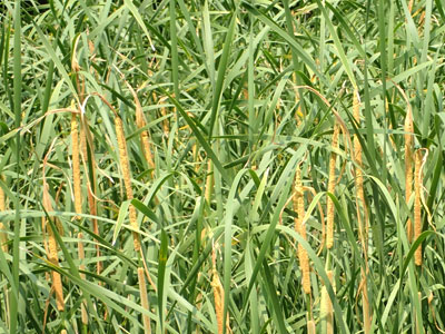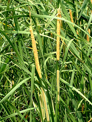 ヒメガマは雌の花穂の上に花のつかない部分があり、雄の花穂との間が離れている。 ベージュ色した雌穂の長さ6〜20cm、 黄色の雄穂の長さは10〜30cm。 |