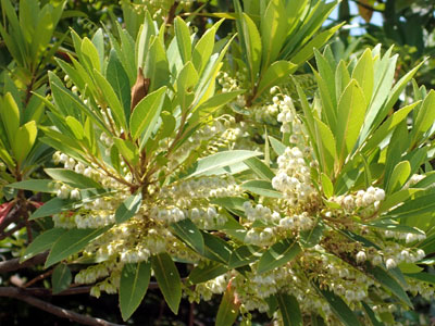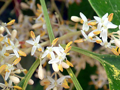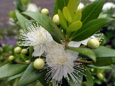 別名 ミルテ(ミュルテ)ドイツ語名、マートル(英語名) 「祝いの木」とも言われている。 5弁花の真白い花で長い雄しべが多数。 |