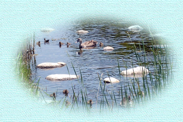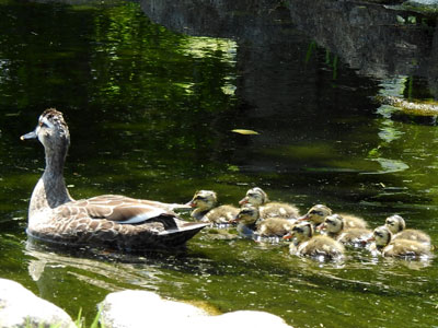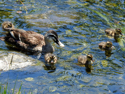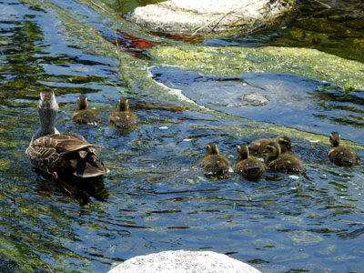 | 今年初、カルガモ親子に出会いました。8羽の子カルガモです。 | |