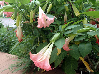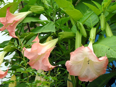 別名 エンジェルス トランペット 葉腋に薄ピンク色の大きな花が1個ずつ垂れ下がって付く。 花冠は長さ20〜35cmの漏斗状で先はトランペット状に開く。 |