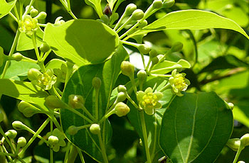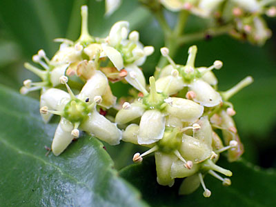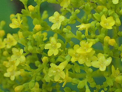 新葉の脇から散形花序をだし、 黄緑色の小さい花を数個まばらにつける。 |