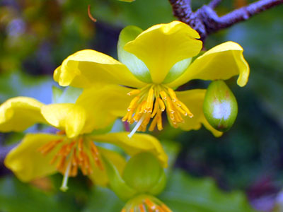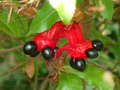 別名 オクナ セルラタ 学名 Ochna serrulata 赤い萼と黒く熟した果実 (ミッキーマウスの姿に見立てた) |