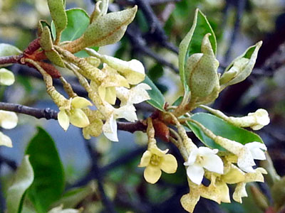 | 葉腋に淡黄色の花が1〜3個垂れ下がってつく。 | |
