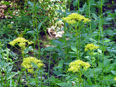 茎の頂きに多数の黄色の花が集まり、平な花序となっている。 茎は60〜100cm。葉は対生して羽状に深く裂けている。 |
