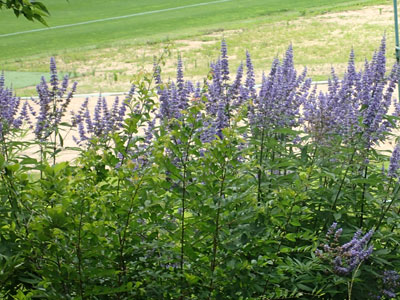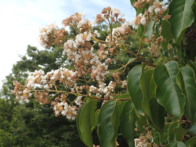 大木になったシマサルスベリ 枝先に円錐花序をだし白い花を多数つける。 花序の長さは10〜20cm。 花は直径1.5cmと小さいが密集して付いている。 |