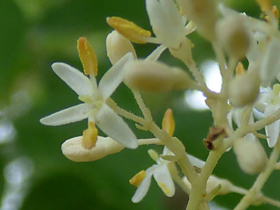 葉腋に4〜7cmの総状花序を出し、白色の小さい花を15〜20個ほどつける。 花弁とガク片は5個、花弁の先は糸状に裂けている。 |