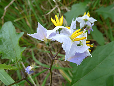 花枝は節の間から出て数個の花をつける。 花冠は径2.5cm、白色または淡紫色。 以前 見たワルナスビの果実はこちらに! |
