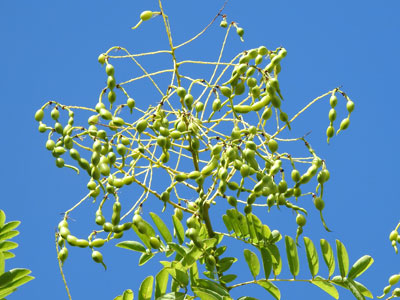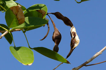 果実は豆果、長さは約10cm、 さやの外側は褐色、内側は白っぽい。