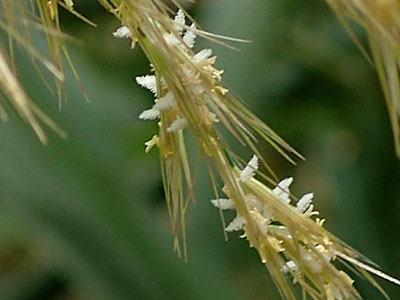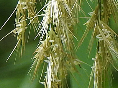 小穂は長さ12〜17mm、2〜4の小花よりなる。 白いフワフワ状は雌花、薄黄色いのは雄花と思われる。 |