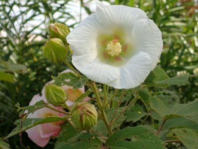 | 葉は楕円形。花が花弁4個、外側は白色、内側はピンク色。長い雄しべは赤く多数。 | |