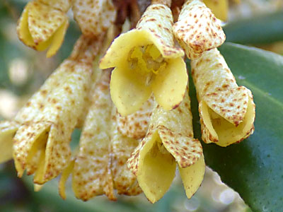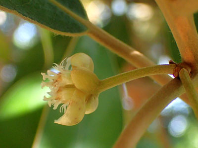 葉腋に白〜淡黄褐色の花を数個つける。ガク筒に4個の稜があり角ばっている。 花は淡黄色に褐色の斑入り模様、外面は銀色の鱗状毛が密生し、褐色の鱗状毛が混じる。 |