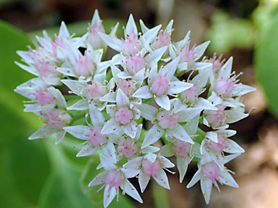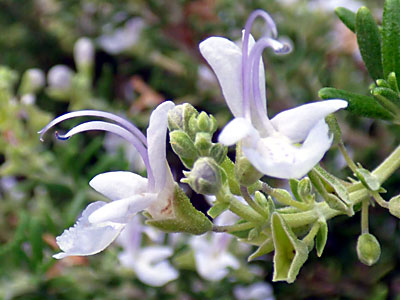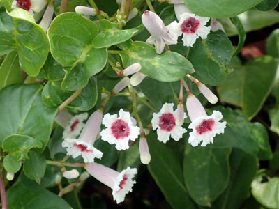 花は長さ1cmほどの筒型。花冠の先は5裂、 花冠の外側は白色、内部は暗赤色。 筒部の外側淡いピンク色、微細な毛が密生。 |
