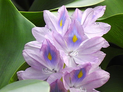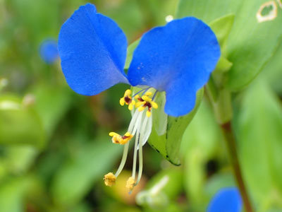 花は左右相称形、がく片3、花弁3、おしべ6、めしべ1 花弁3のうち 2枚は大きくコバルト色、下の1枚は白色 ガク片3は半透明色 おしべ6のうち 花粉を出すのは長い2本だけ、あとの4本は花粉がない仮おしべで鮮黄色。 |