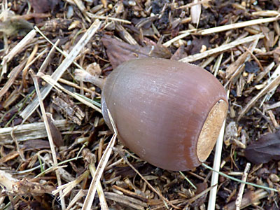ドングリは直径1.5〜2cmの やや長めの球形。 柱頭が柄のように残っている。カシワのドングリの特徴。 |