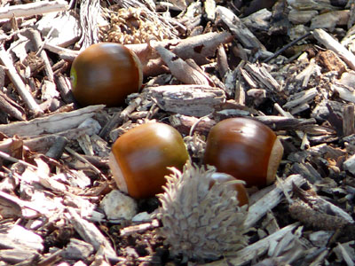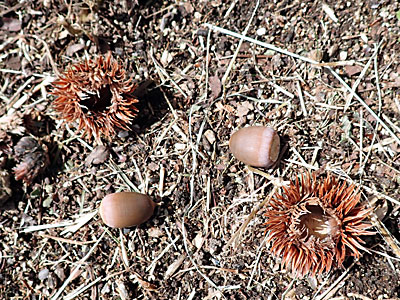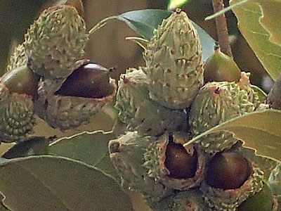 | スダジイの殻斗が裂けてドングリが顔をだして・・・ | |