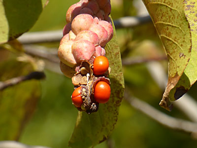10/18 総合公園ではコブシの果実(袋果)が裂けて朱色の種子が覗く季節になってきました。