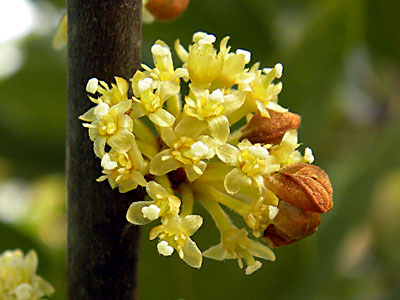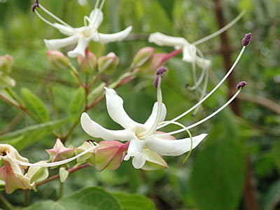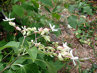 葉腋に香りのよい白い花を束生する。雌雄別株、雄株だけが知られている。 |
