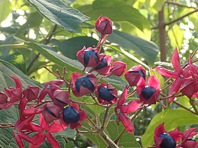 | 果実は核果、光沢のある藍色、ガクは花の後、濃紅色となり、星状に開く。 | |