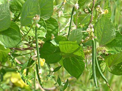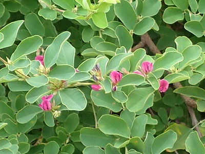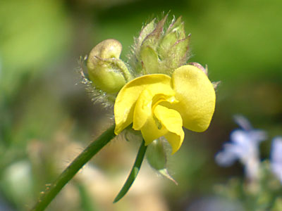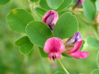 | 花の形は正面から見ると左右で形が違っている横長に旗弁に 舟弁と翼弁が左側に片寄っている。 | 葉は3小葉、豆果は長さ4〜5cm、円柱形 |