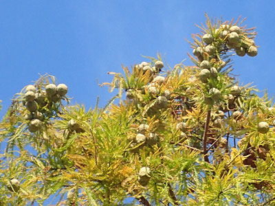 | 晩秋には球果は緑色から褐色に熟す。果鱗は10〜12個。 | |