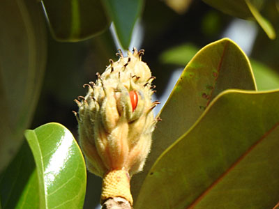 コブシの袋果が裂開して朱色の種子が覗いていました。 樹木ウォッチング コブシのページをご覧ください |
