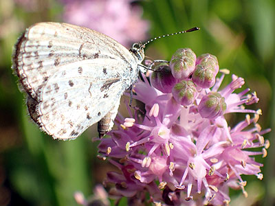 ツルボの花にヤマトシジミ。 花はピンク色、多数集まって長い穂になっている。 |