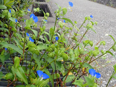 9/16 陽光緑地の路傍ではツユクサの花がたくさん咲きだしていました。園内ではマルバツユクサに出会うことが多いこの頃です。