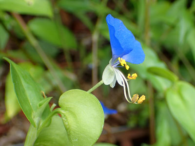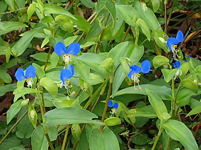 花はツユクサより小さく径8〜10mm、花弁の色は淡い。 葉は丸みを帯び、長さ3〜5mm。 |