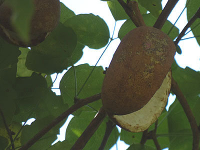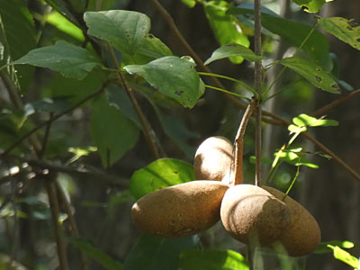 落下した果実(刮ハ) 果実は3裂、光沢のある褐色の種子をだす。 |