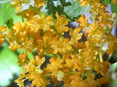 雌雄別株。これらは雄花。 葉腋から散形花序だし、淡黄緑色の花を多数つける。 |