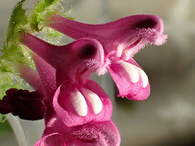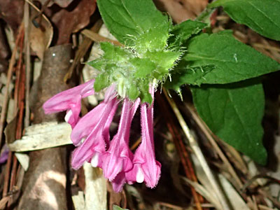 花冠は長さ16〜18mm、淡紅色で、上下2唇に分かれている。下唇には2個の白いふくらみある。 花は大型の苞葉に抱かれ、苞葉の先は鋭く尖り、へりには毛状の歯が並んで目立つ。 |