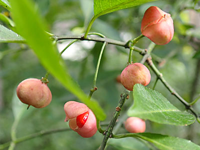 果実は刮ハ、淡紅色。 直径約1cmの傾三角形で4個の稜がある。熟すと4裂して橙赤色の種子が顔を出す。 |