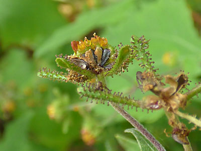 総苞は5個で長さ1cmほど。腺毛がある。 舌状花冠(褐色)は長さ3.5mmと短い、筒状花(黄色)を囲む。 |