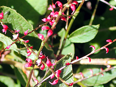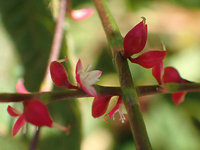 花被(がく)は深く4裂、上半分は赤く、下半分は白く、紅白の対照からミズヒキの名がある。 花が終わると花被を閉じて果実をまもり、2本の花柱も残る。 |