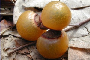 果実は核果、直径2〜3cmの球形、 果皮は袋状で半透明なあめ色 |