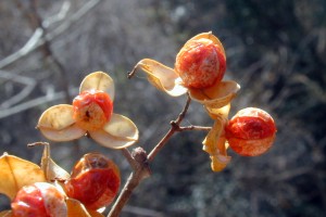 熟すと3つに割れて、 橙赤色の仮種皮に包まれた種子が顔を出す。